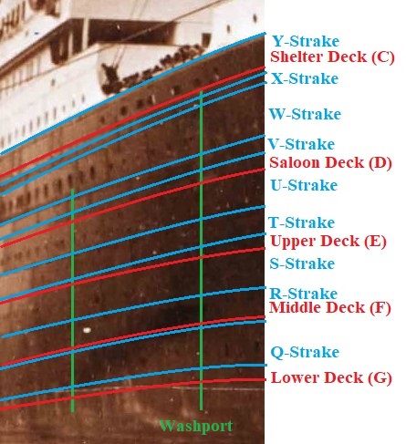 Als Strake wird die horizontale Reihe der Außenbeplattung eines Schiffes bezeichnet. Gezählt werden diese bei der Titanic alphabetisch, von A unten am Kiel bis Z am unteren Ende des B-Decks;