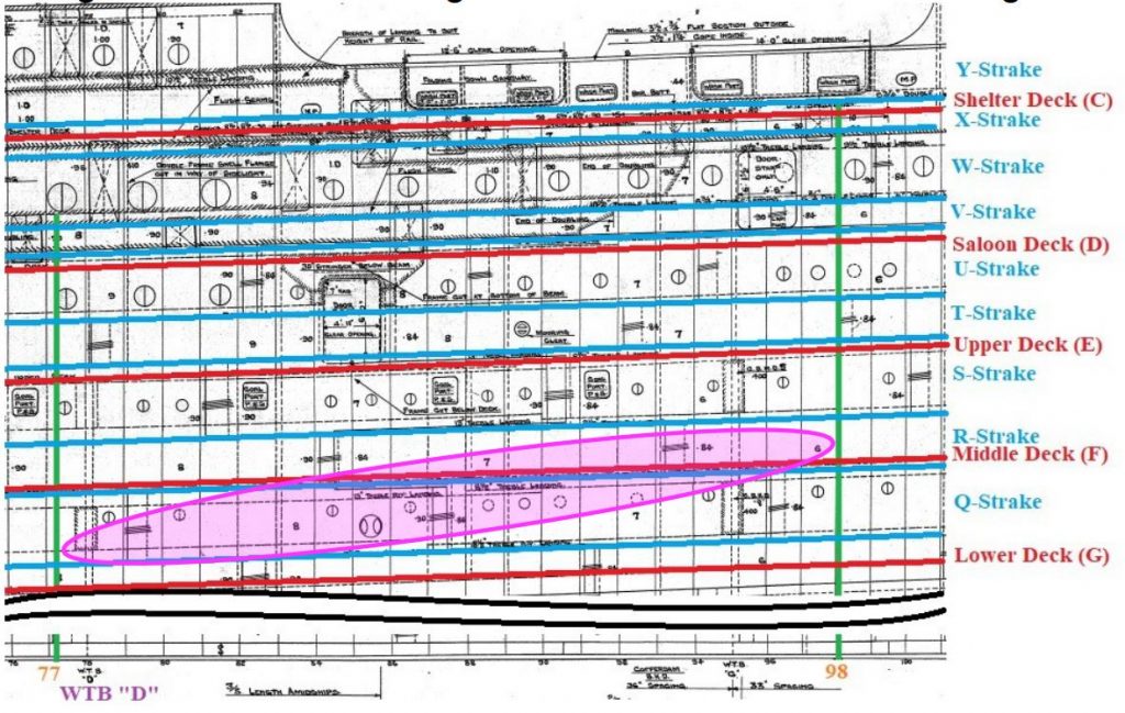 Ein Abgleich mit dem Shellplatingplan, der zwar der Olympic zugehörig, für diesen Zweck aber völlig brauchbar ist, lässt eine genaue Positionierung des Flecks zu. Siehe Abbildung 4.